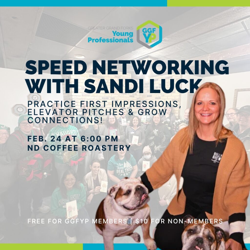 Join us at the ND Coffee Roastery with Sandi Luck! Sandi is the Founder & CEO of Bully Brew Coffee. She will be coordinating a fun and quick-paced speed networking experience. This is a great opportunity to perfect your elevator pitch, learn how to make memorable first impressions, and meet other young professionals—all in a supportive, high-energy environment where everyone’s here to learn and grow together.