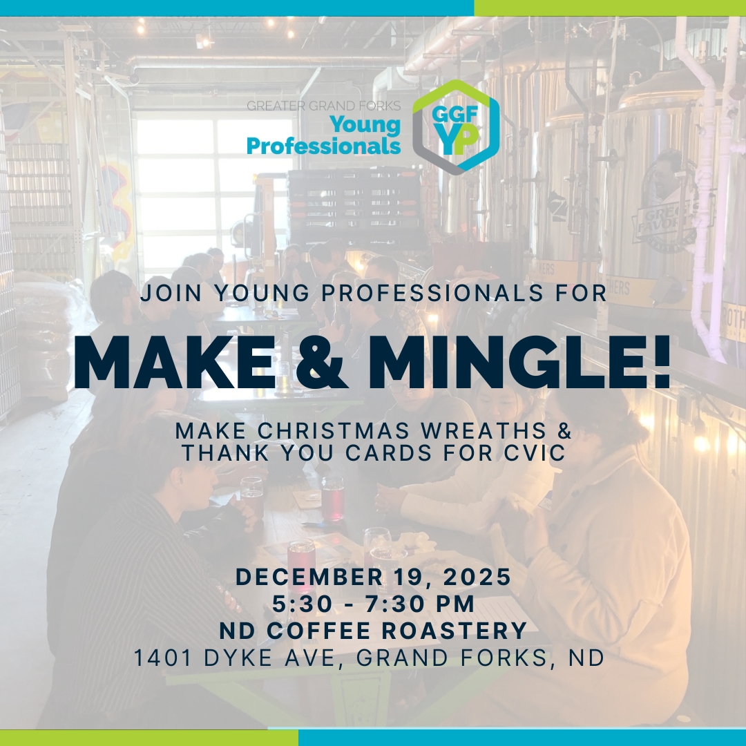 Join us at the ND Coffee Roastery on December 19th for Make & Mingle! Let's make wreaths and thank you cards while we mingle with fellow Young Professionals in the area. |